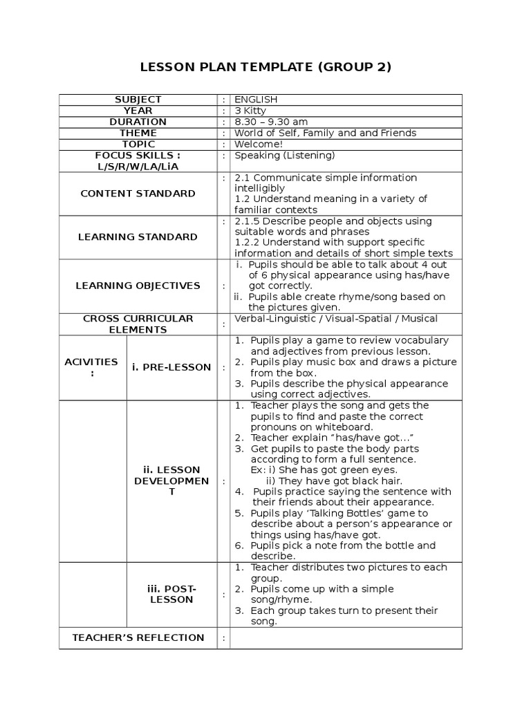 But we found that with the genki english lesson plans, especially the songs, the kids actually learnt these concepts quicker in english than they did in their mother tongue. Kssr eng year 1 teaching phonics 2 unit 2 all about me phonemes: Did i stick to timings? Esl lesson plan template for young learnersmooncake english brings you weekly videos sharing fun and easy esl games. If you are looking for some beginner.