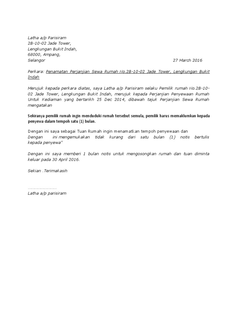 Surat Rasmi Sewa Rumah Blog Mesra H from imgv2-2-f.scribdassets.com Kejam ke kalau nak bagi notis keluar rumah kepada penyewa di bulan ramadhan yang mulia ini? Nyatakan dengan jelas dalam perjanjian yang anda akan memberi notis atau pemberitahuan awal kepada pihak penyewa jika anda ingin membuat pemeriksaan berkala terhadap rumah anda. بِسْمِ اللهِ تَوَكَّلْتُ عَلَى اللهِ، لَا حَوْلَ وَلَا قُوَّةَ إِلَّا بِاللهِ. Siapa tahu ada yang bisa bantuin kita. Penyewa seorang lelaki berumur 40 tahun dan pemilik rumah wanita berusia 27 tahun. Bagi menandakan persetujuan terhadap surat perjanjian ini, tandatangan pemilik rumah, penyewa dan saksi (jika ada) diperlukan dalam tenancy agreement. Secara umum, penyewa mempunyai notis jika mereka mengetahui peristiwa tersebut. Tiada daya dan kekuatan kecuali dengan allah. doa masuk kamar mandi.
